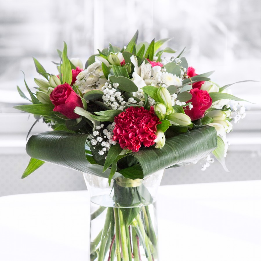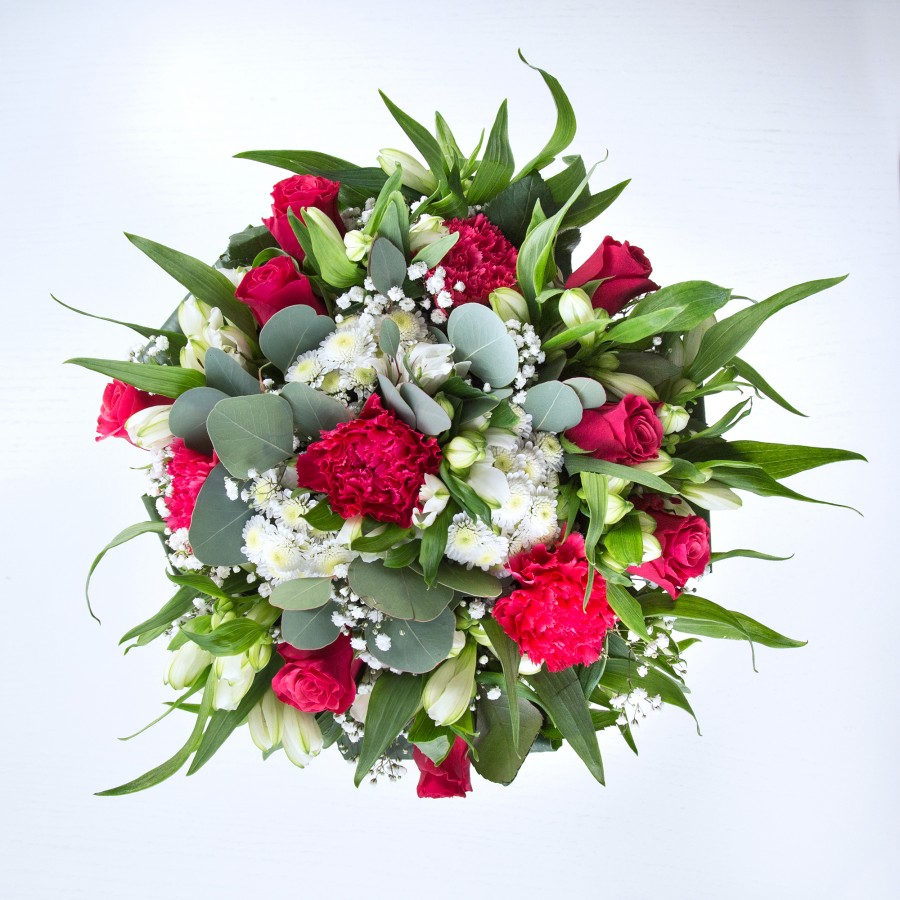 Immerse yourself in the captivating beauty of our unique bouquet, meticulously crafted to inspire creativity and awe. This stunning arrangement features a harmonious blend of vibrant red roses, delicate white chrysanthemums, and airy gypsophila, elegantly complemented by the purity of white alstroemeria and lush aspidistra leaves.